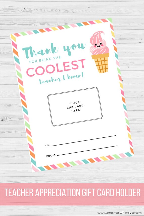 Ice cream free printable | Teacher appreciation gifts, Teacher ... Card Holders. Teachers play a big role in our childrens lives, and we love showering them with appreciation! My thank you for being the coolest teacher I know appreciation gift card holders are an easy way to say thank you to the teachers in your life. Click thru to grab yours! #teacherappreciation #giftcardholder #printable #endofyear #icecream.